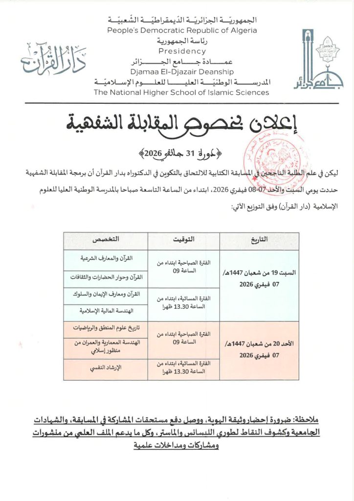 كما تُعلِم الإدارة الطّلبة النّاجحين أنّ المقابلات الشّفهيّة قد حُدّدت يومي السّبت والأحد، 07 و08 فبراير 2026م، ابتداءً من السّاعة التّاسعة (09:00) صباحاً بمقرّ المدرسة (دار القرآن)، وفق التّوزيع الزّمنيّ والتّخصّصات المذكورة في جداول التّوزيع.
